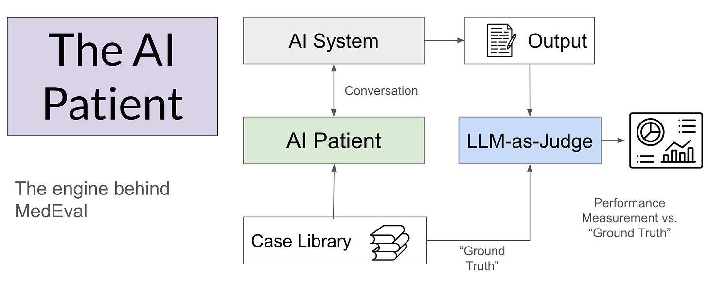 The engine that powers MedEval is the AI Patient. These are synthetic cases that encode a “ground truth” upon which to base the interaction with the AI system being tested. These AI Patients are conceptually the same as the standardized patients encountered by clinical trainees throughout their career. They have a complete backstory and a known diagnosis upon which to base the subsequent evaluation of performance. Because the cases can be reused, performance in individual cases and in aggregate can be examined over time. The evaluation uses an LLM-as-judge to score the case series, with focused human review utilized selectively.