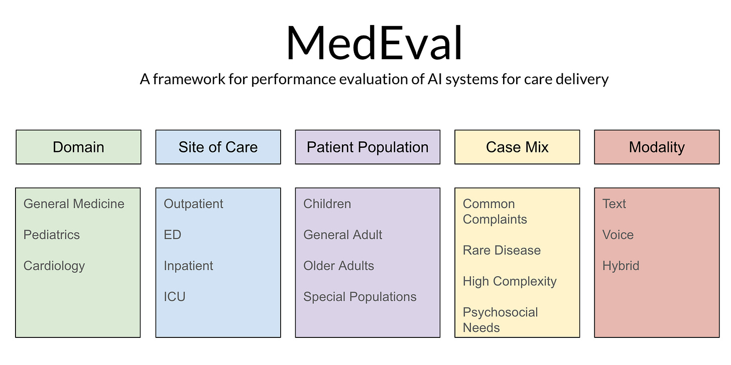 MedEval is a measurement framework for others to build upon, not a prescription for how the evaluation must be carried out. As we migrate from static to dynamic benchmarks, the MedEval framing can be applied to diverse types of AI systems in care delivery, with results tailored directly to the specific usage expected of the technology.
